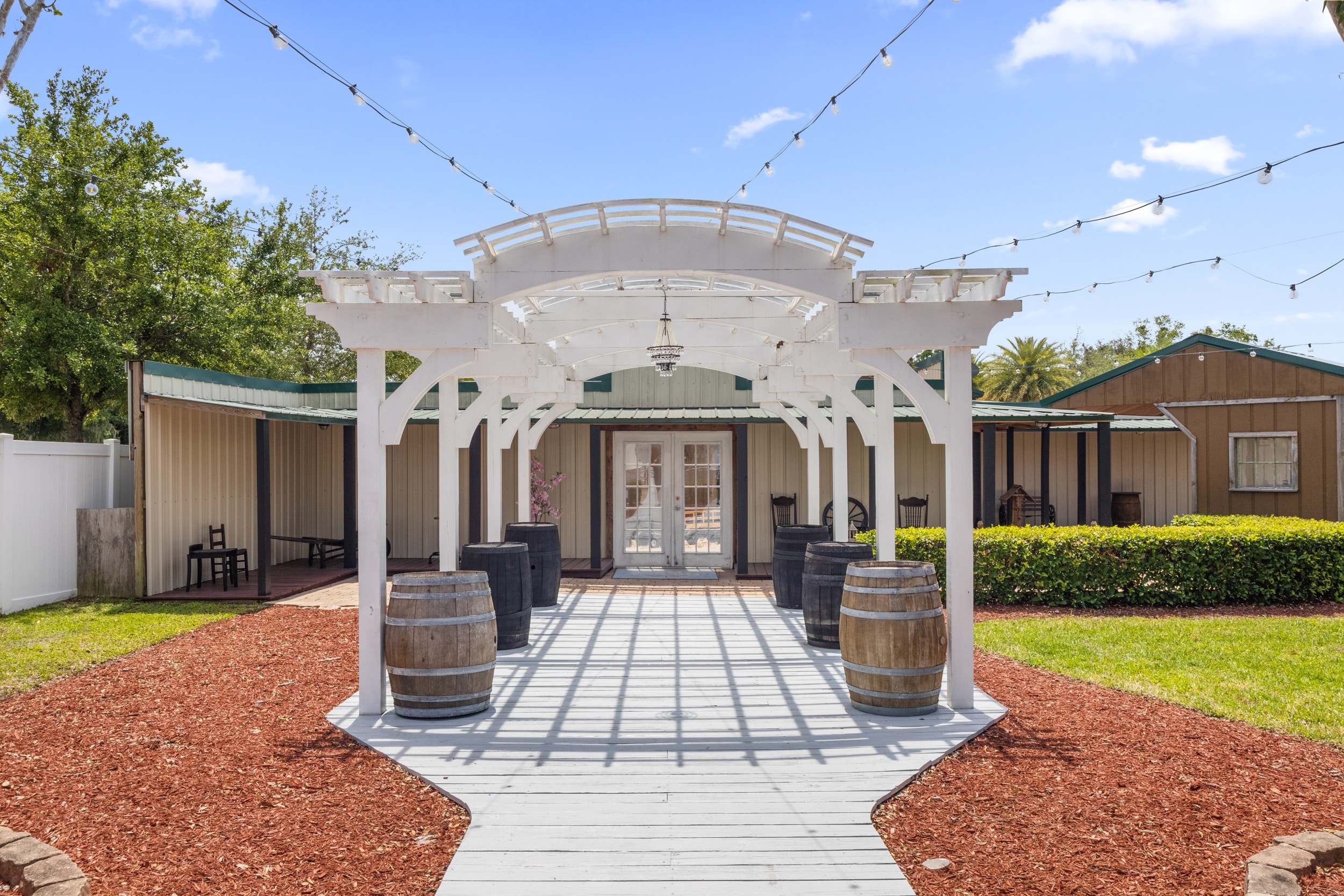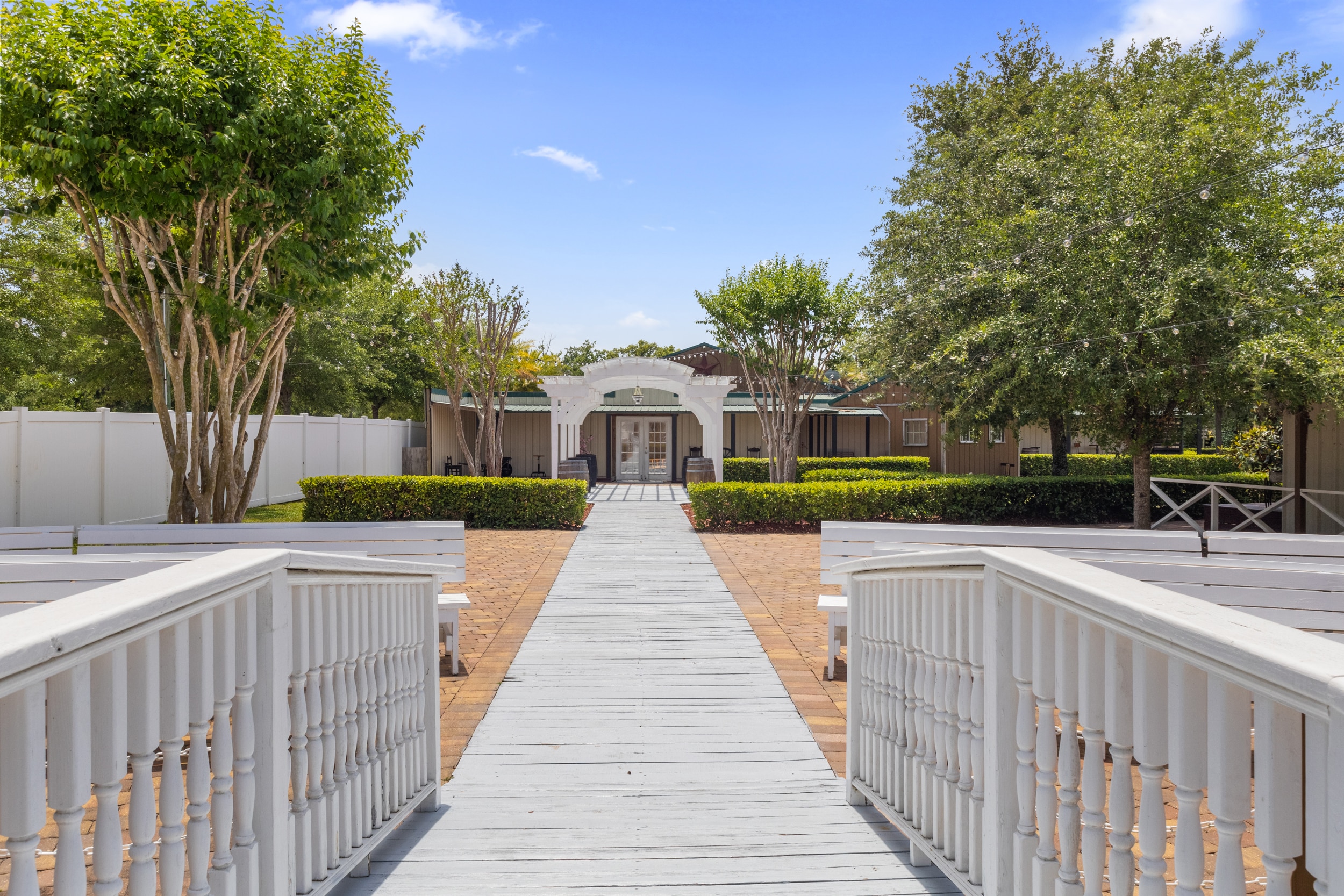 The elevated entrance with white railings adds architectural interest and creates countless photo opportunities, while the mature landscaping and professional lighting ensure your ceremony looks magical from dawn to dusk.
