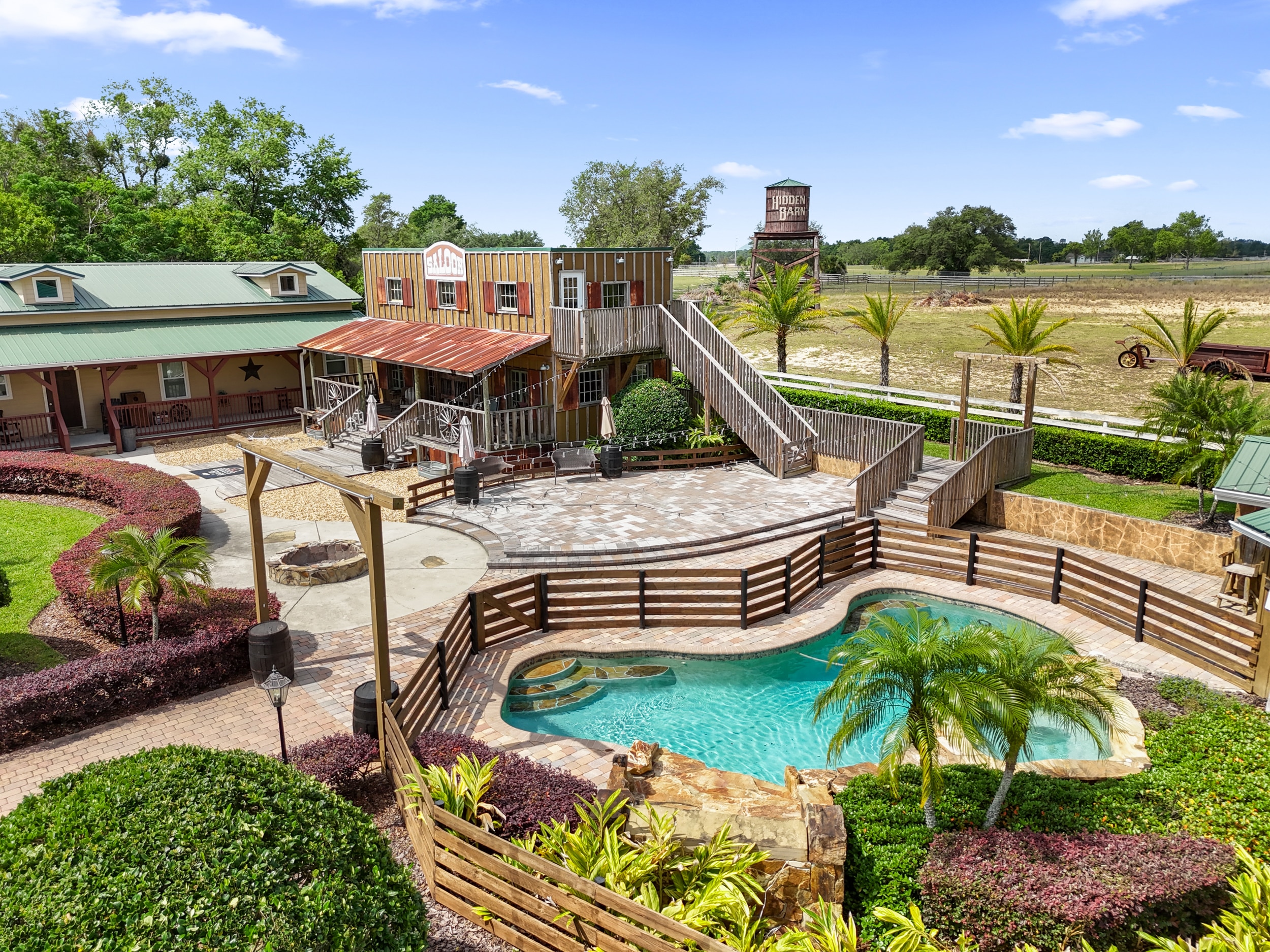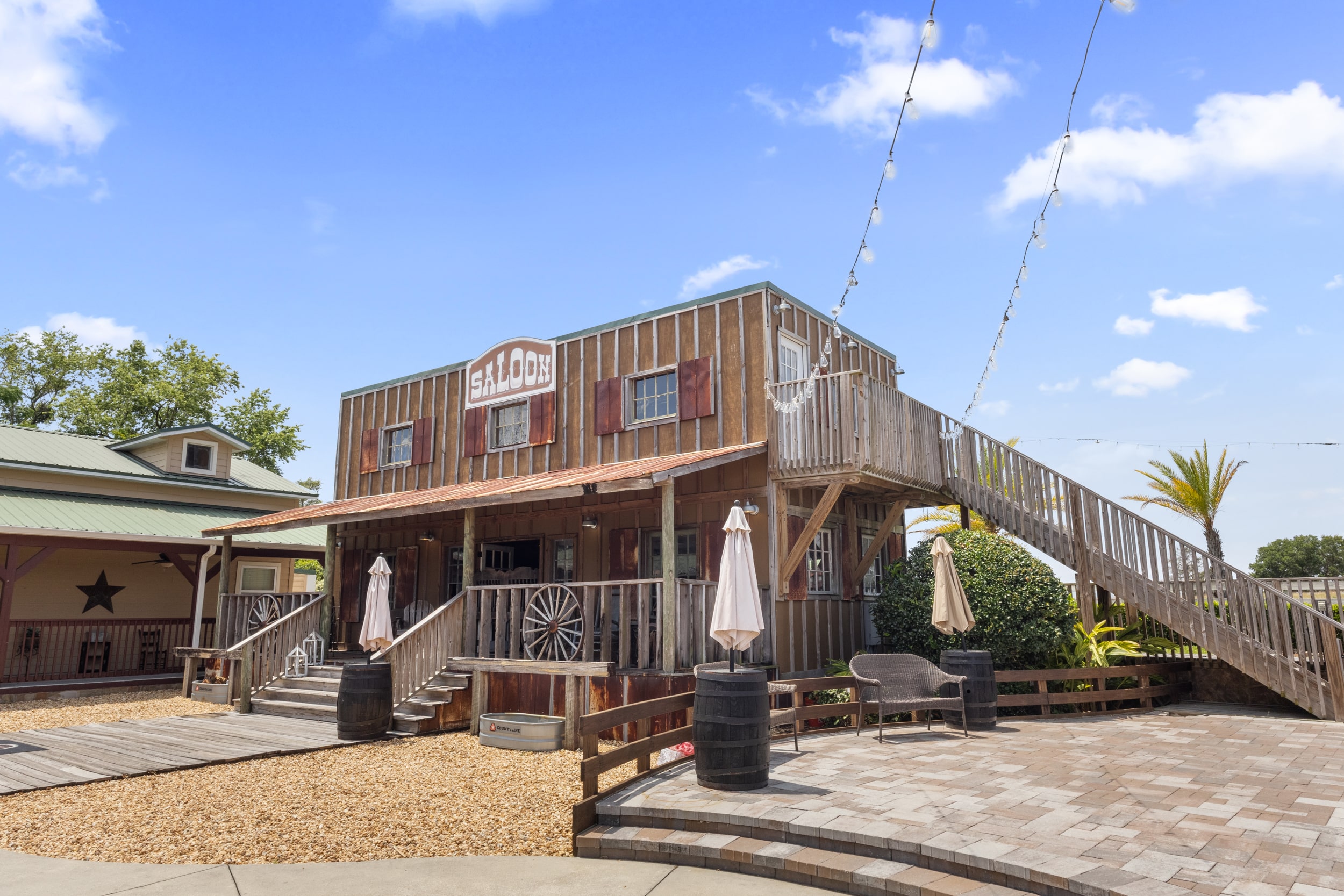 With string lighting casting a warm glow and multiple gathering areas across different levels, your guests can mingle, toast, and celebrate while feeling like they’ve stepped back in time to a classic Western saloon.