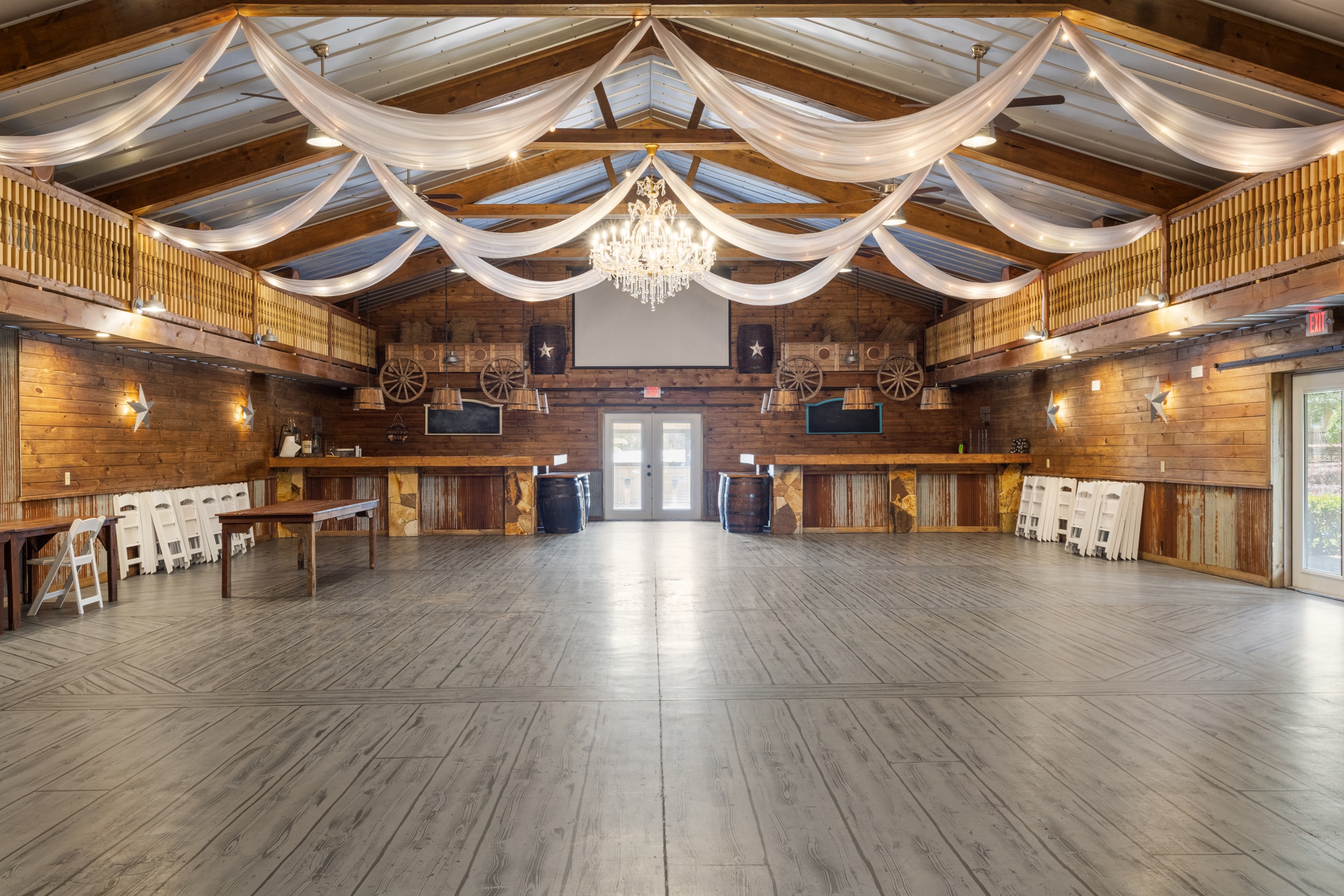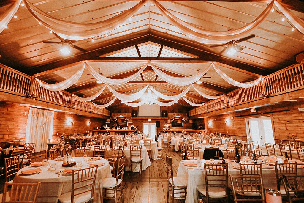 Our signature Barn combines the authentic charm of exposed wooden beams and vaulted ceilings with elegant touches like stunning chandeliers and flowing white draping.